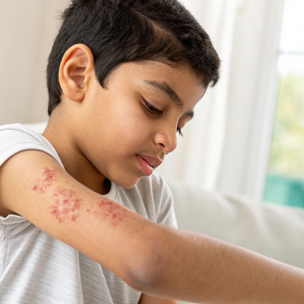 - Appearance: Red, itchy patches, usually on the face, elbows, or knees.